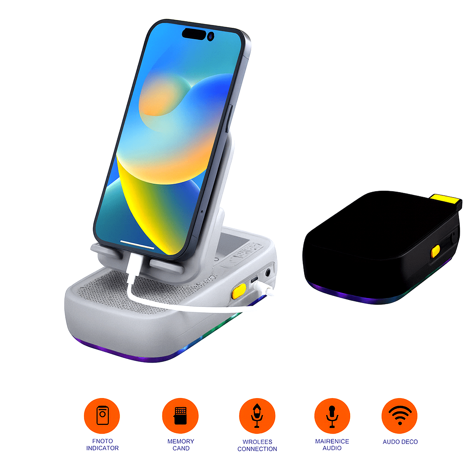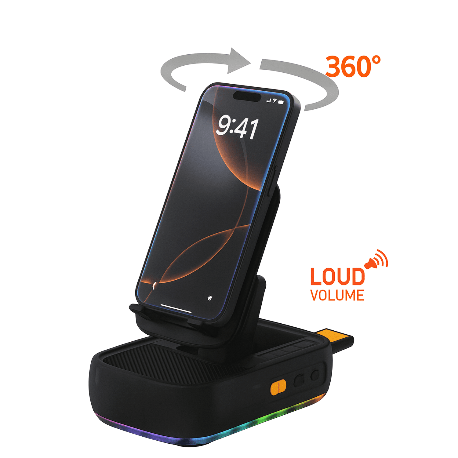 Integrated Power & Charging: Acts as a portable station to charge your phone via cable (as shown) and potentially functions as a built-in power bank (verify capacity).