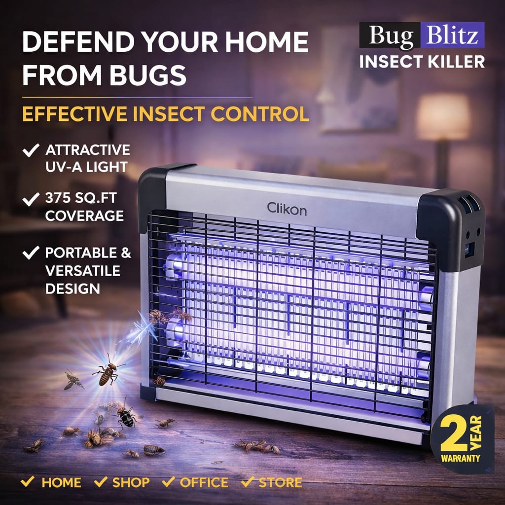 Clikon Bug Blitz insect killer is a reliable device designed to eliminate mosquitoes and flying insects efficiently. It uses UV light technology to attract insects and a powerful electric grid to destroy them instantly. With 16W power and coverage up to 375 sq. ft., it is ideal for indoor use. The portable design allows easy placement or hanging, while the durable ABS body ensures safety.