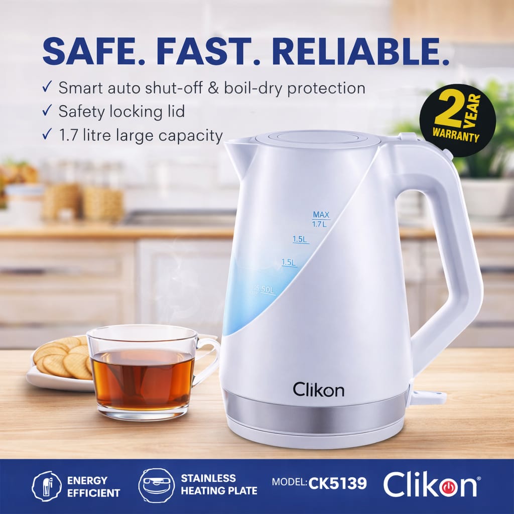 The Clikon CK5139 Electric Kettle is a practical and efficient appliance designed to boil water quickly and safely. With a generous 1.7-litre capacity, this kettle is ideal for preparing tea, coffee, instant noodles, soups, and other hot beverages at home or in the office.