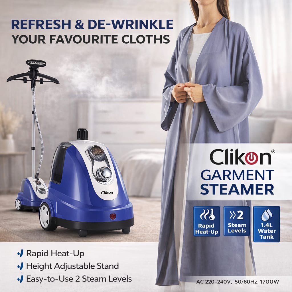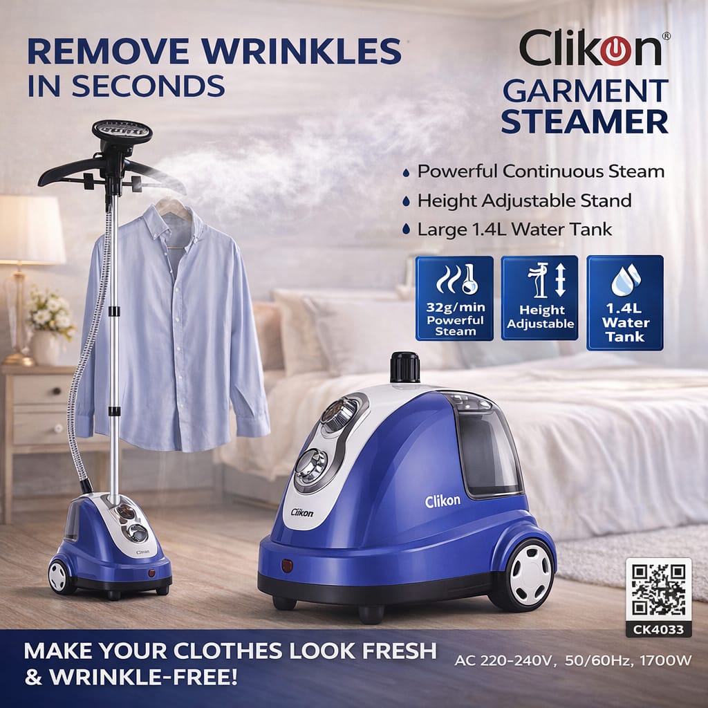 Designed for convenience, the Clikon garment steamer is easy to operate, safe for most fabrics, and perfect for home use. It is ideal for quick touch-ups, everyday garment care, and maintaining professional-looking clothes.