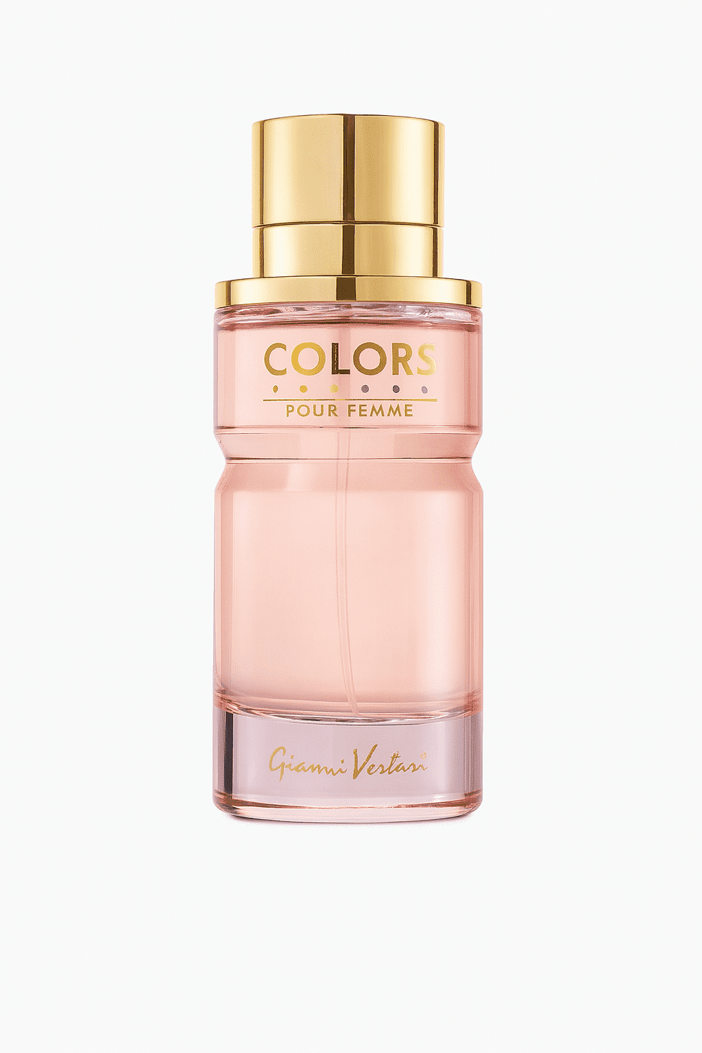 Packaging: Elegant pink bottle with golden accents and colorful box