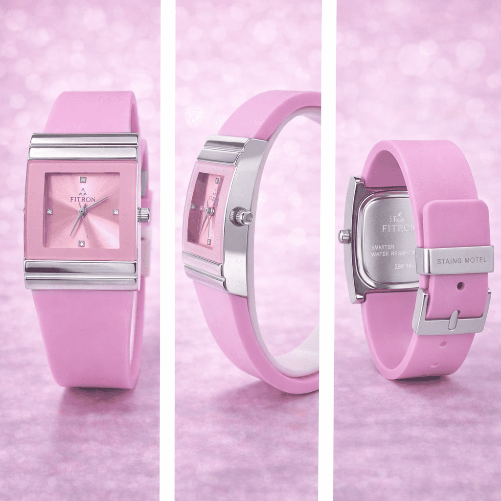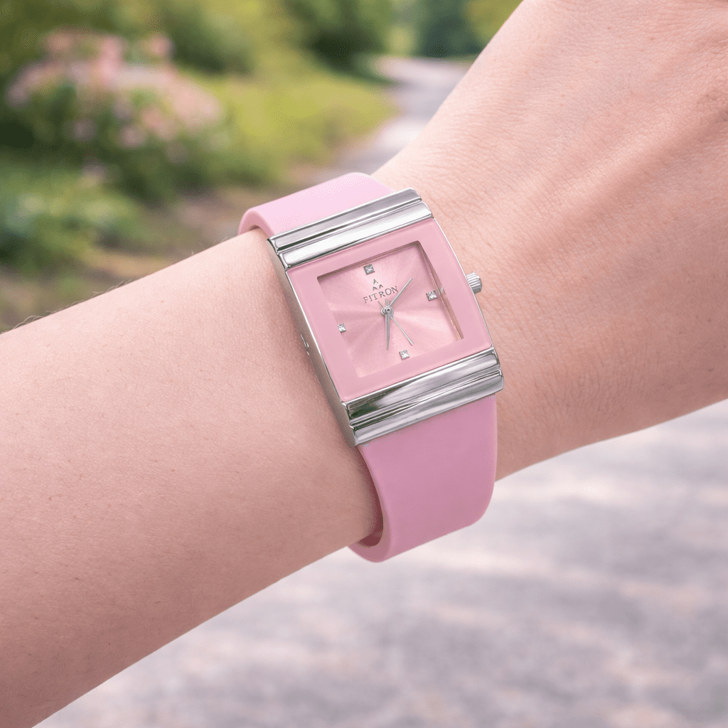 Add a soft and elegant touch to your style with this beautiful FITRON women’s watch featuring a stylish pink square dial and modern minimalist design. The dial showcases a sunburst pink finish enhanced with crystal-style hour markers and sleek silver-tone hands, creating a feminine and sophisticated appearance.