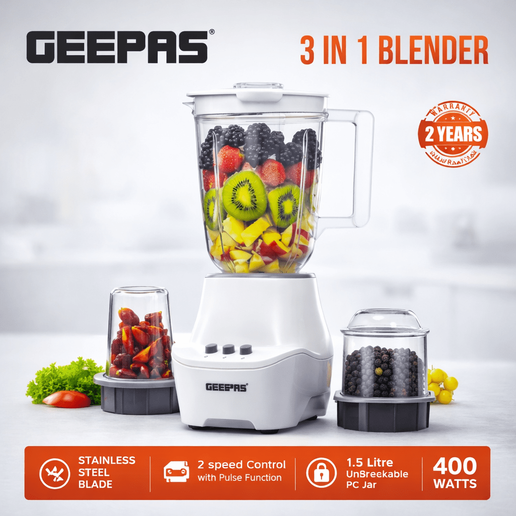 Transform your kitchen routine with the high-performance Geepas 3-in-1 Blender. This versatile appliance is designed to simplify your meal prep, whether you are crafting vibrant fruit smoothies, grinding fresh coffee beans, or blending homemade salsas. Engineered for durability and precision, it combines a sleek modern design with the rugged power needed for daily kitchen tasks.