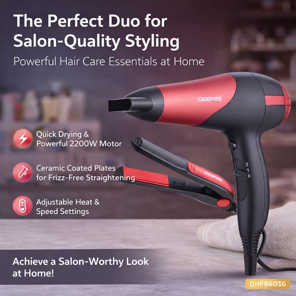 Achieve salon-quality styling at home with the Geepas Hair Dryer and Straightener Combo. Designed for powerful performance and convenience, this styling duo includes a 2200W high-speed hair dryer for quick drying and a ceramic-coated hair straightener for smooth, frizz-free results.