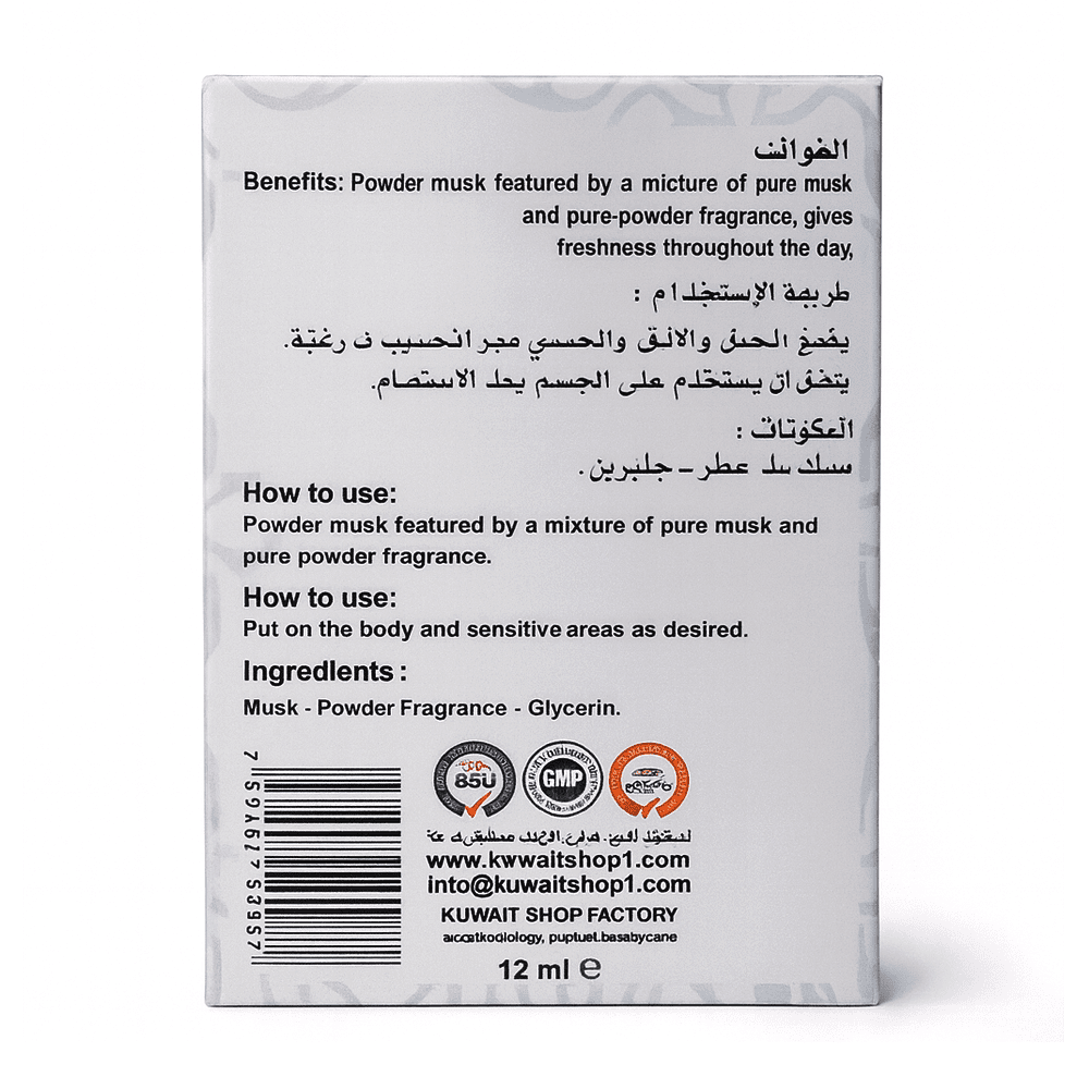 Wrap yourself in the soft, comforting scent of Kuwait Shop’s Powder Musk. This beautiful fragrance blends pure musk with a delicate powder aroma to provide a feeling of clean freshness that lasts all day. Its gentle, skin-friendly formula with glycerin is perfect for daily use, leaving your skin soft and beautifully scented.