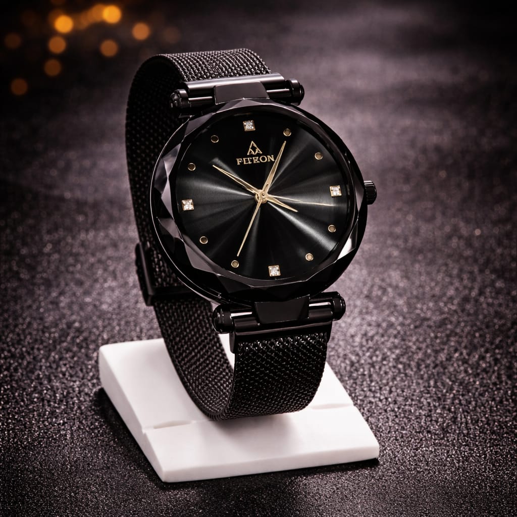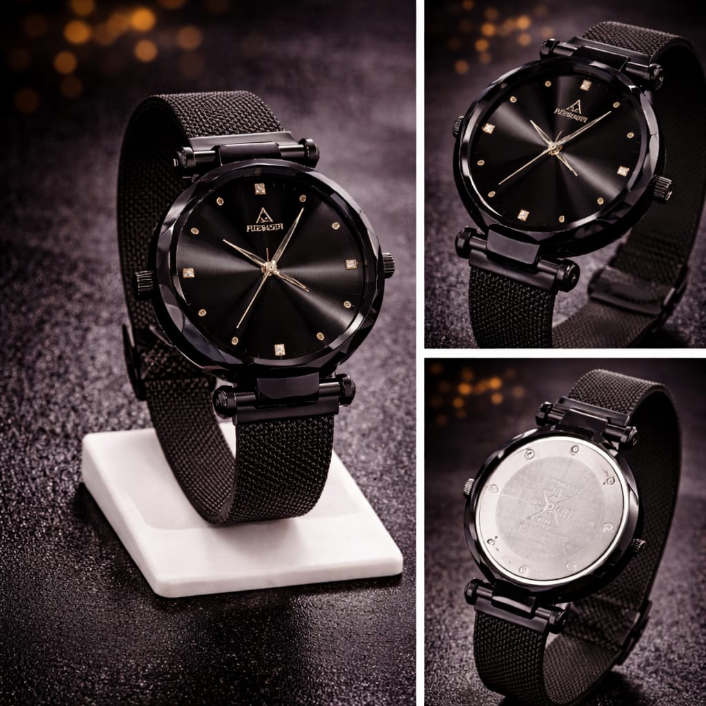 The slim profile and premium mesh strap provide a comfortable fit, making it perfect for long wear throughout the day. Its quartz movement ensures precise and reliable timekeeping, while the stylish all-black design adds a bold and versatile touch to any outfit.
