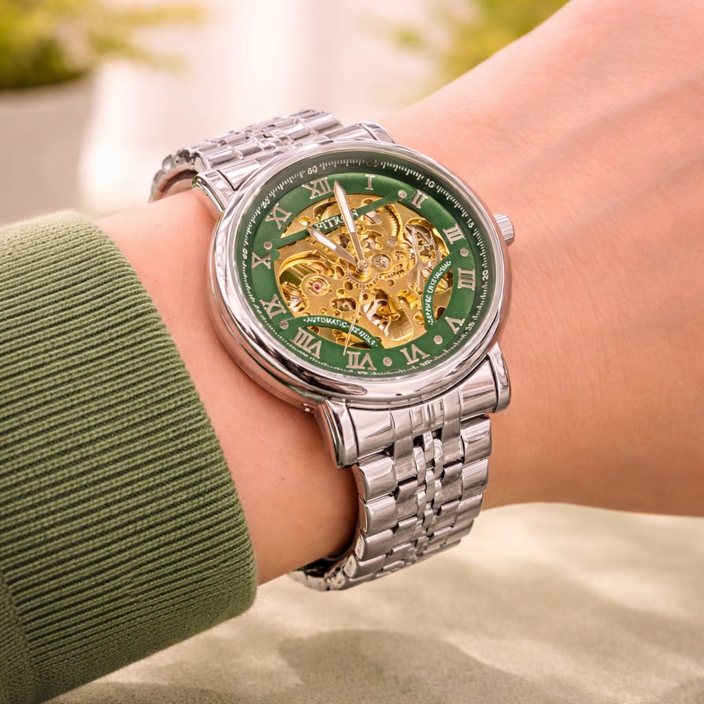 The striking green dial combined with Roman numeral markers adds a bold and classy touch, while the stainless steel strap ensures durability and long-lasting comfort. Perfect for formal occasions, business wear, or everyday fashion, this watch blends timeless design with modern craftsmanship.