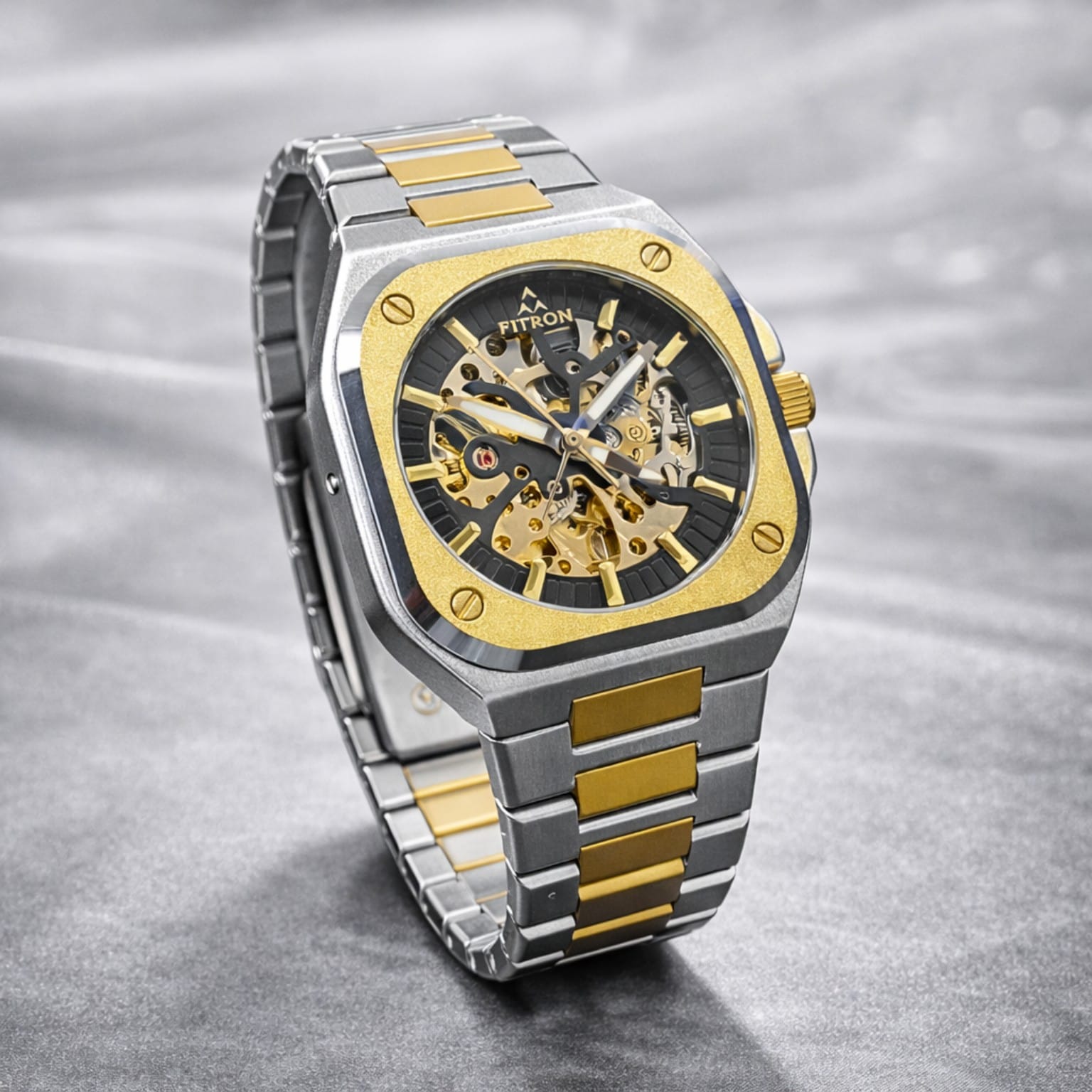 Skeleton dial design showcasing inner mechanism, automatic movement for precise timekeeping, durable gold and steel strap for long-lasting use, stylish luxury design ideal for formal and everyday wear.