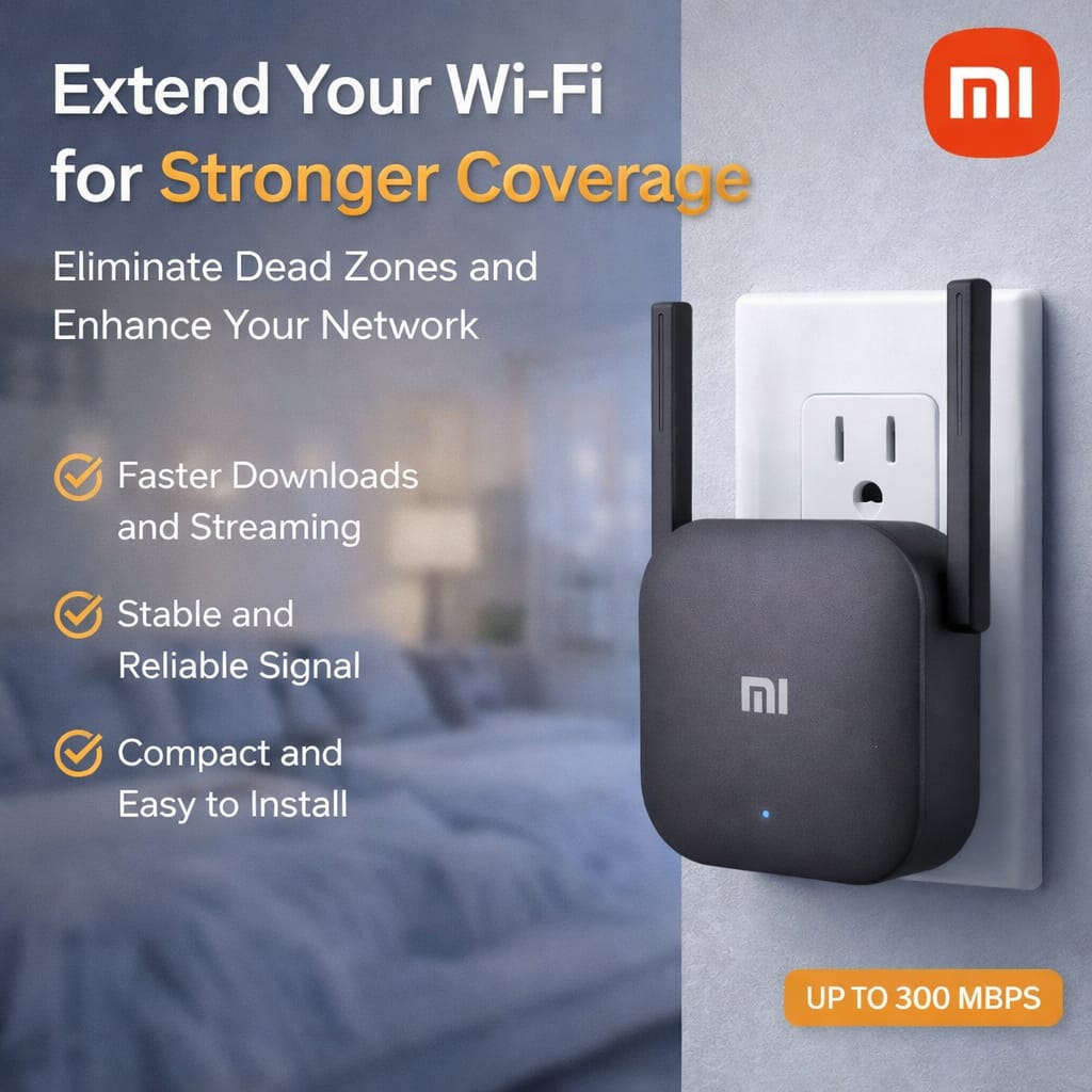 Equipped with dual external antennas, it provides wider coverage and improved signal strength across multiple rooms. The extender is easy to set up using the Mi Home app, allowing quick installation without technical hassle.