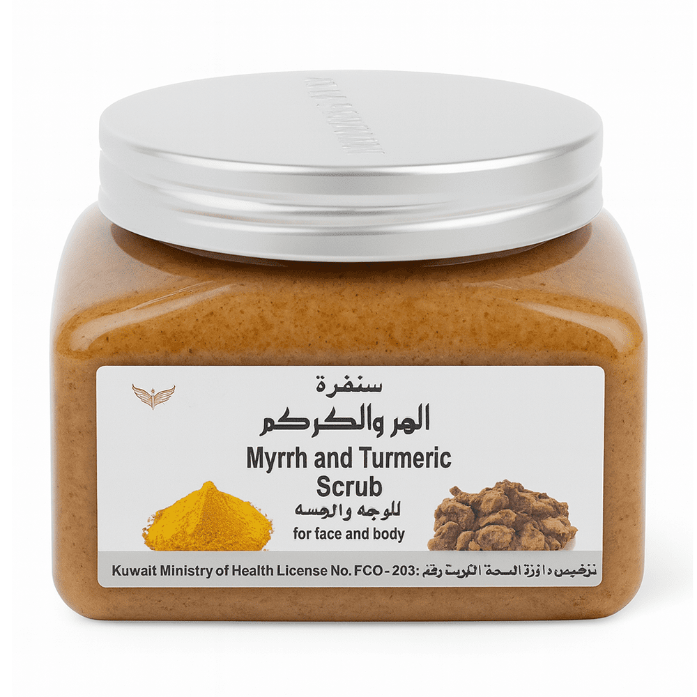 Step into a world of natural beauty with our exquisite Myrrh and Turmeric Scrub. This powerful yet gentle exfoliating treatment harnesses the age-old benefits of two revered natural ingredients: Myrrh and Turmeric.