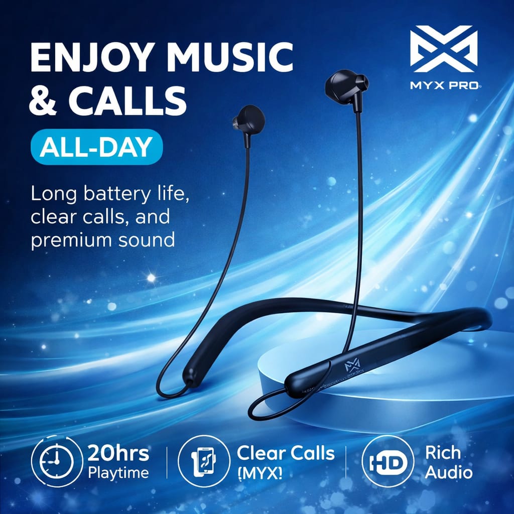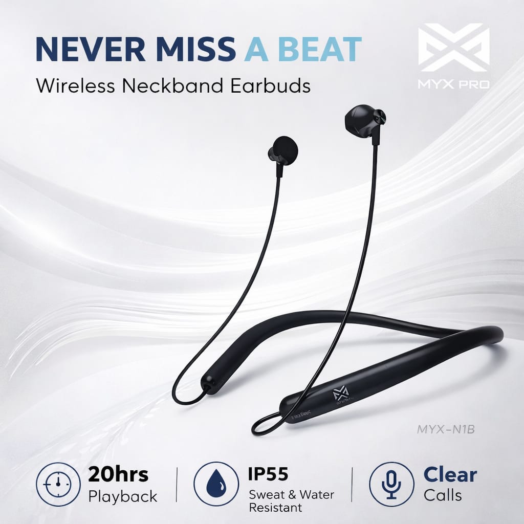 Enjoy seamless audio and all-day comfort with the MYX Pro Wireless Neckband Earbuds, designed for active lifestyles and everyday use. Featuring an ergonomic neckband design, these earbuds provide a secure and comfortable fit for long listening sessions.