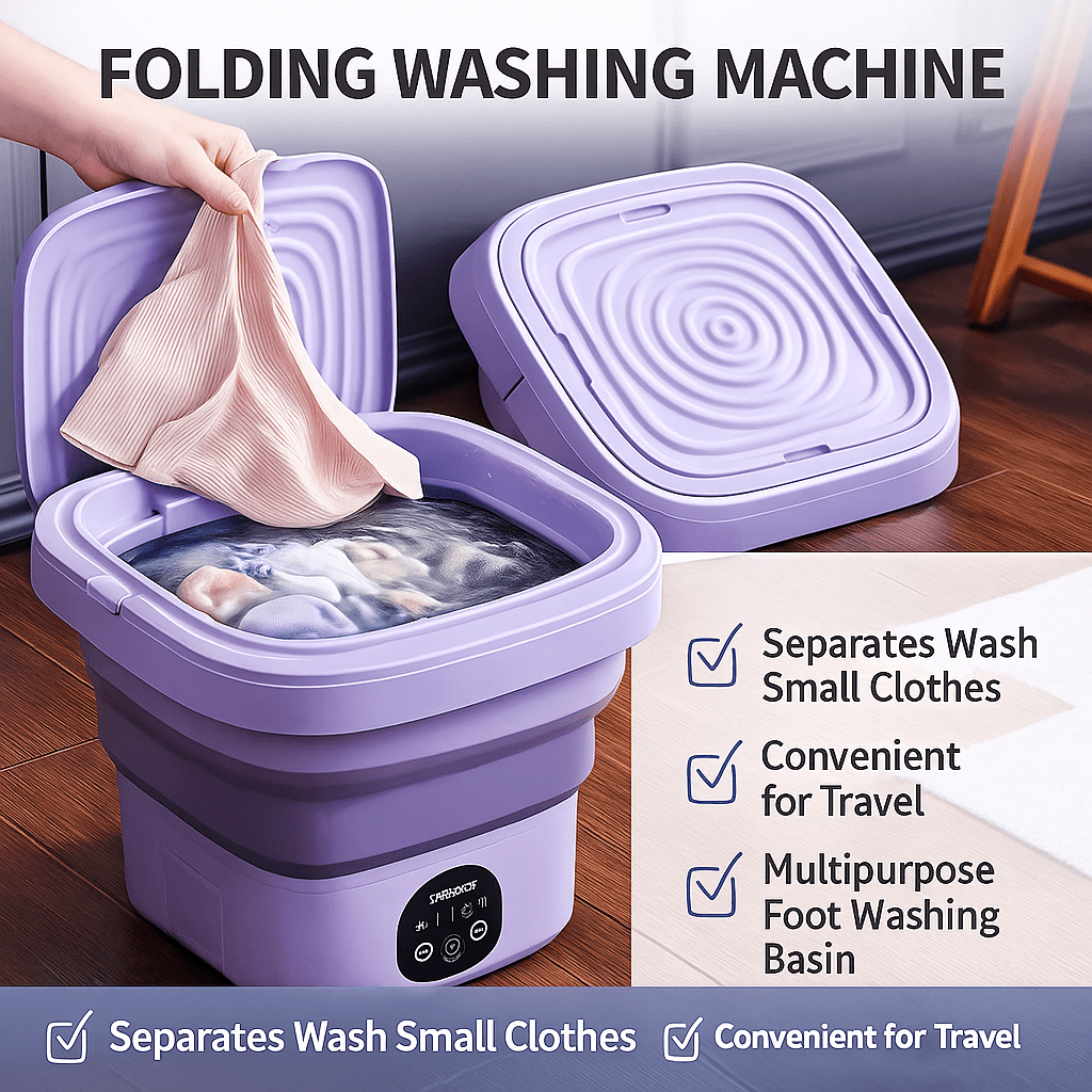 Feature Detail Material Durable, flexible silicone & ABS Capacity 1.8 – 2.5 Liters (Typical for Mini Washers) Folded Size Approx. 11.8 x 11.8 x 4 inches Voltage 100-240V (US/Global Compatible) Included Folding Washer, Power Adapter, Drain Hose (if applicable) -