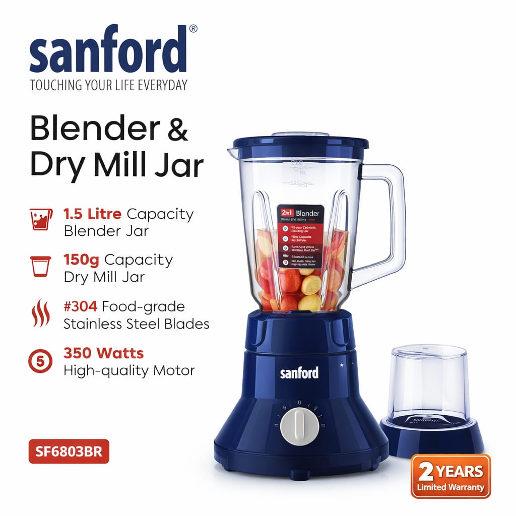 Whether you want fresh smoothies, sauces, or ground spices, the Sanford Blender with Dry Mill Jar is a practical and reliable addition to any modern kitchen.