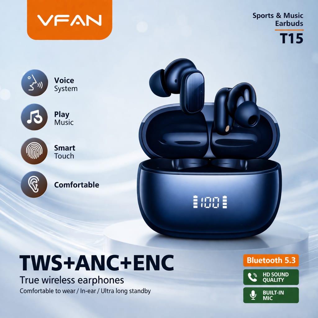 The VFAN T15 Wireless Earbuds are designed for an immersive audio experience with advanced ANC (Active Noise Cancellation) and ENC technology. These earbuds reduce unwanted noise while ensuring clear voice calls and rich sound quality.